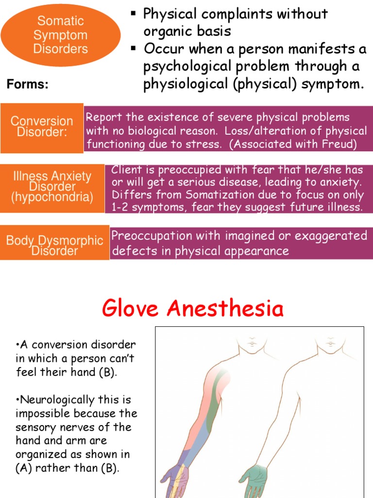 Identifying and Treating Somatic Symptom Disorder in the ... from slide-finder.com My wife has been diagnosed with somatic symptom disorder. Terms in this set (33). She continues to get angry with doctors and can't accept that they can't find anything physically wrong. Digestive symptoms (such as nausea, vomiting, abdominal pain, constipation, and diarrhea). Excessive concern about health and physical symptoms. Sexual symptoms (such as pain. Somatic symptom disorder (or somatization disorder) usually involves pain and severe neurological symptoms (such as headache, fatigue). The symptoms may or may not be traceable to a physical cause including general medical conditions.